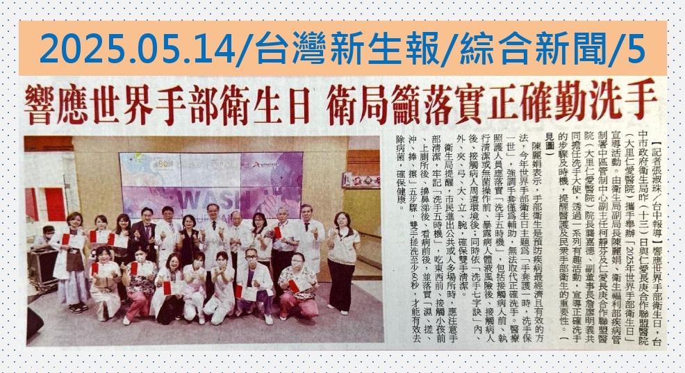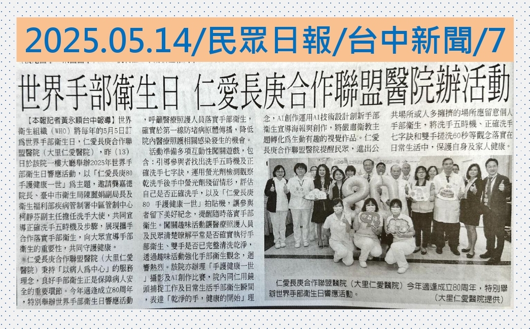 仁愛長庚合作聯盟醫院(大里仁愛醫院)秉持「以病人為中心」的服務理念,良好手部衛生正是保障病人安全的重要環節。今年適逢成立80周年特別舉辦世界手部衛生日響應活動,呼籲醫療照護人員落實手部衛生,確實於第一線防堵病原體傳播,降低院內醫療照護相關感染發生的機會。