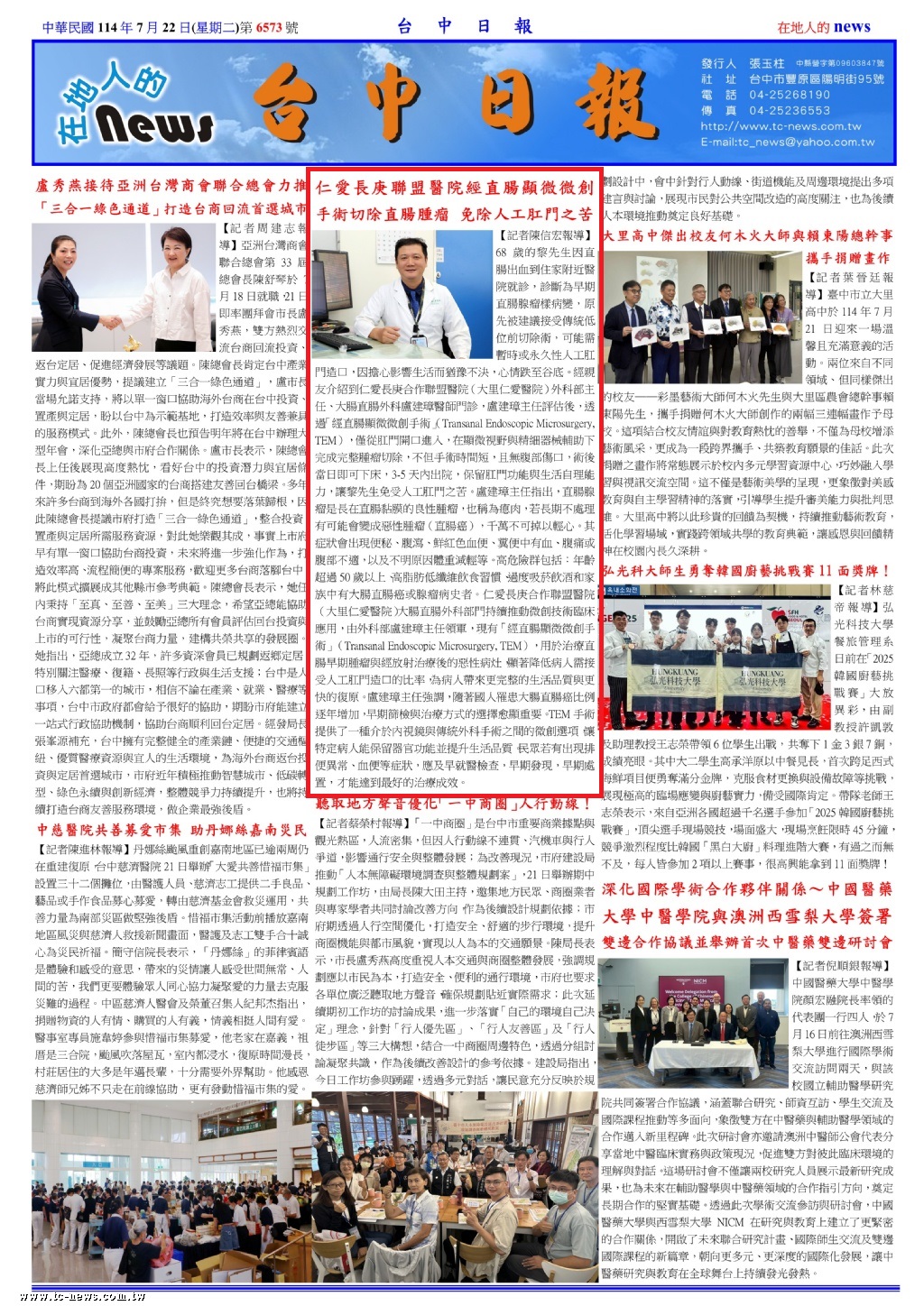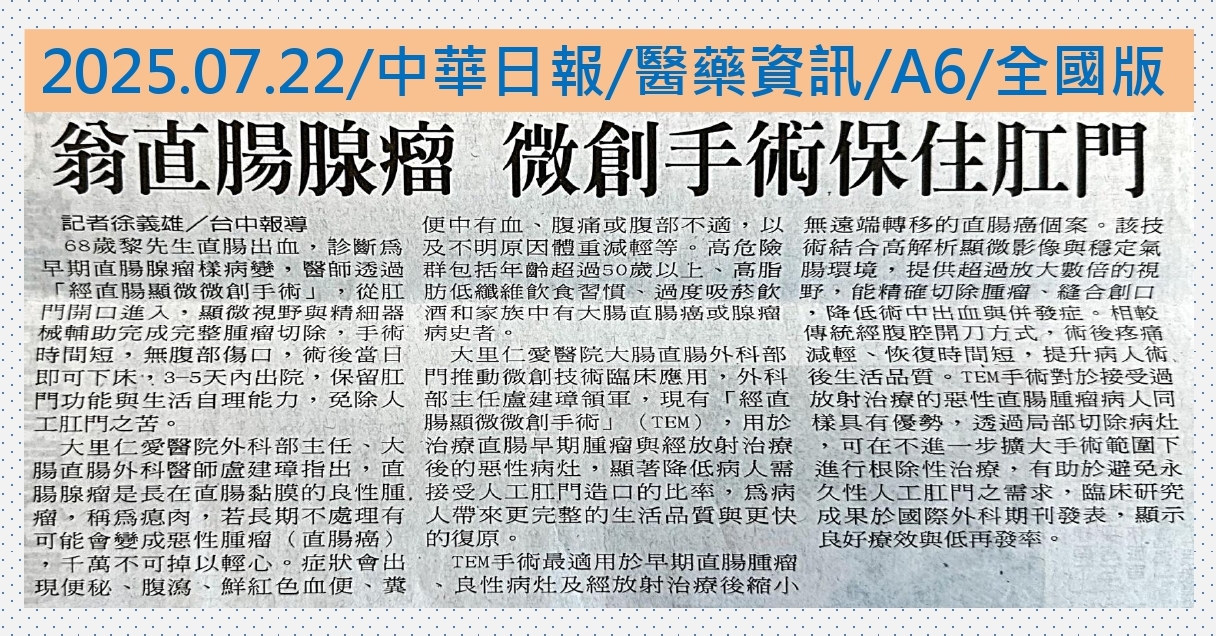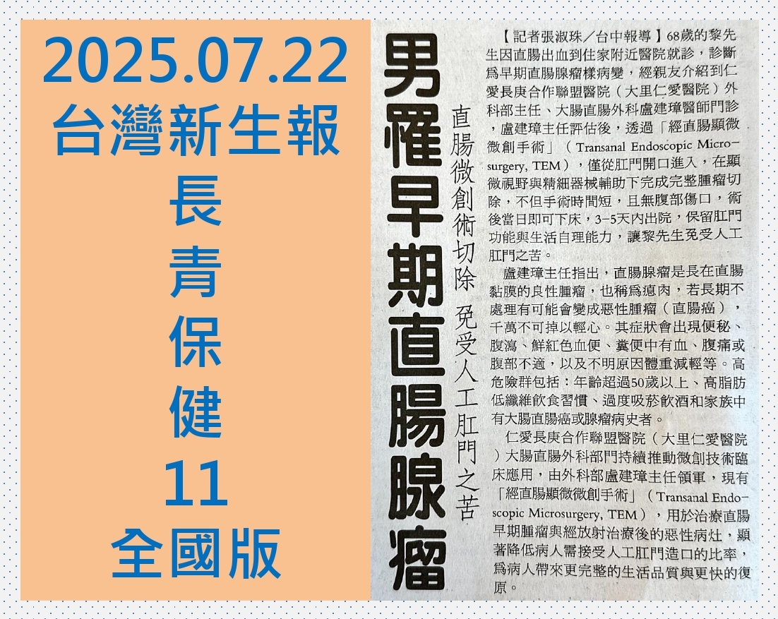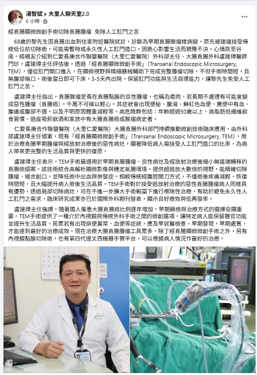 仁愛長庚合作聯盟醫院(大里仁愛醫院)大腸直腸外科部門持續推動微創技術臨床應用,由外科部盧建璋主任領軍,現有「經直腸顯微微創手術」(Transanal Endoscopic Microsurgery, TEM),用於治療直腸早期腫瘤與經放射治療後的惡性病灶,顯著降低病人需接受人工肛門造口的比率,為病人帶來更完整的生活品質與更快的復原。