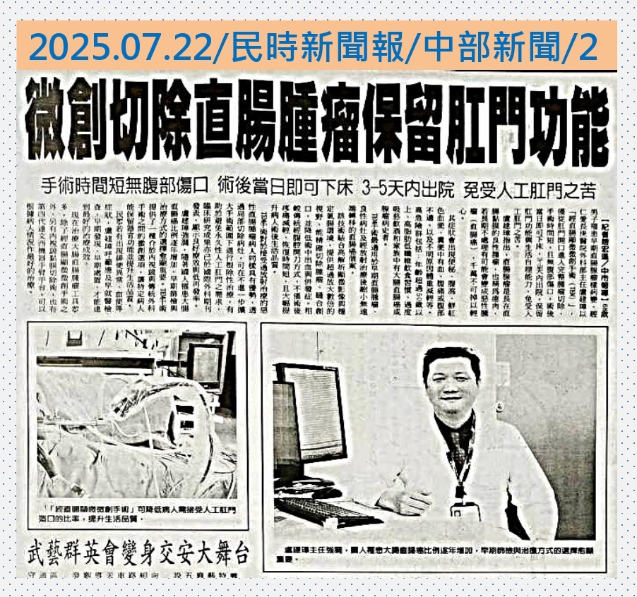 68歲的黎先生因直腸出血到住家附近醫院就診,診斷為早期直腸腺瘤樣病變,原先被建議接受傳統低位前切除術,可能需暫時或永久性人工肛門造口,因擔心影響生活而猶豫不決,心情跌至谷底。經親友介紹到仁愛長庚合作聯盟醫院(大里仁愛醫院)外科部主任、大腸直腸外科盧建璋醫師門診,盧建璋主任評估後,透過「經直腸顯微微創手術」(Transanal Endoscopic Microsurgery, TEM),僅從肛門開口進入,在顯微視野與精細器械輔助下完成完整腫瘤切除,不但手術時間短,且無腹部傷口,術後當日即可下床,3-5天內出院,保留肛門功能與生活自理能力,讓黎先生免受人工肛門之苦。