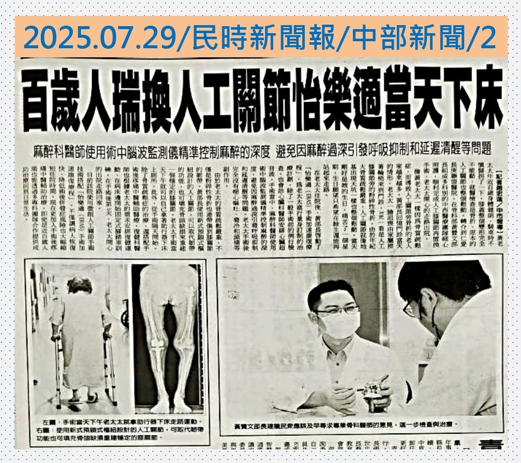 隨著台灣進入超高齡社會,罹患退化性關節炎的民眾逐漸增加。近年來不僅接受手術年齡層越來越高,有多重內科疾病和像黃老太太一樣有嚴重骨質疏鬆症的老人家也越來越多。目前該院使用微創人工關節手術技術搭配「怡樂適(ERAS)手術加速康復療程」,不僅讓病人恢復快、降低術後併發症風險也大幅縮短住院時間。現在更加入手術後疼痛中醫輔助治療,即便是近百歲人瑞也能透過多專科團隊合作提供成功治療回到日常生活。黃部長建議民眾應該及早尋求專業骨科醫師的意見,進一步檢查與治療,開心地享受健康人生。