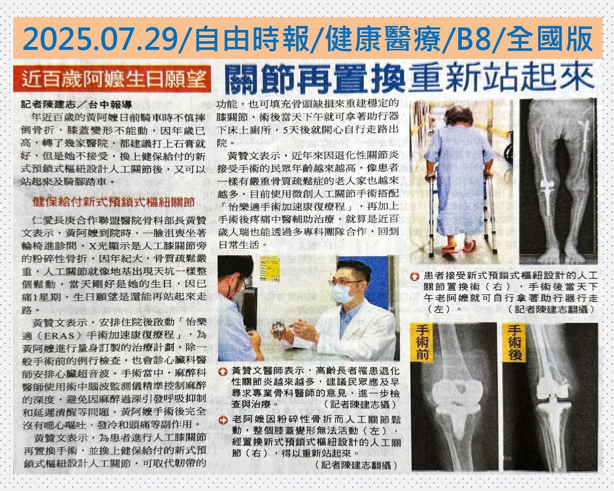 黃老太太年近百歲,耳聰目明且身體健康。每天休閒活動就是騎腳踏車到菜市場買新鮮蔬菜水果,到公園曬太陽散步運動。某天早上騎車時不慎腳拐了一下,整個人就直接跌坐在地上,膝蓋整個變形完全不能動。家屬送老太太至醫院發現是骨折,更麻煩的是原本的人工關節也整個鬆動,醫院因為老太太已近百歲建議打上石膏就好,可是活動力十足的老太太不接受,一個星期內轉了幾家醫院都是相同的答案。最後家屬經朋友介紹將老太太送到仁愛長庚合作聯盟醫院(大里仁愛醫院),在骨科部黃贊文部長的安排下,由骨科、復健科、麻醉科、心臟科、護理師和中醫師團隊的細心照護,順利完成人工膝關節再置換手術,老太太生日願望實現了,開心的走路出院,現在又可以騎腳踏車運動。