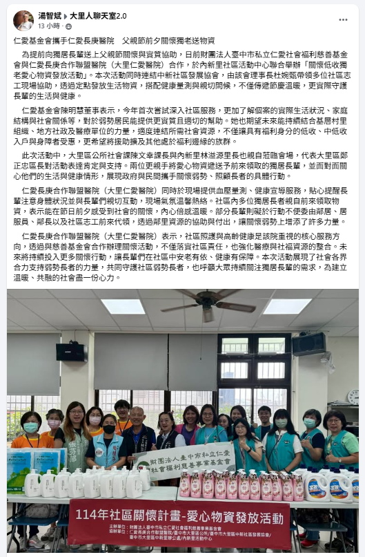 為提前向獨居長輩送上父親節關懷與實質協助,日前財團法人臺中市私立仁愛社會福利慈善基金會與仁愛長庚合作聯盟醫院(大里仁愛醫院)合作,於內新里社區活動中心聯合舉辦「關懷低收獨老愛心物資發放活動」。本次活動同時連結中新社區發展協會,由該會理事長杜婉甄帶領多位社區志工現場協助,透過定點發放生活物資,搭配健康量測與親切問候,不僅傳遞節慶溫暖,更實際守護長輩的生活與健康。