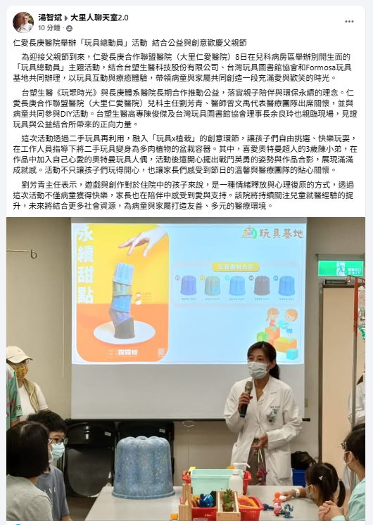 台塑生醫《玩聚時光》與長庚體系醫院長期合作推動公益,落實親子陪伴與環保永續的理念。仁愛長庚合作聯盟醫院(大里仁愛醫院)兒科主任劉芳青、醫師曾文禹代表醫療團隊出席關懷,並與病童共同參與DIY活動。台塑生醫高專陳俊傑及台灣玩具圖書館協會理事長余良玲也親臨現場,見證玩具與公益結合所帶來的正向力量。
