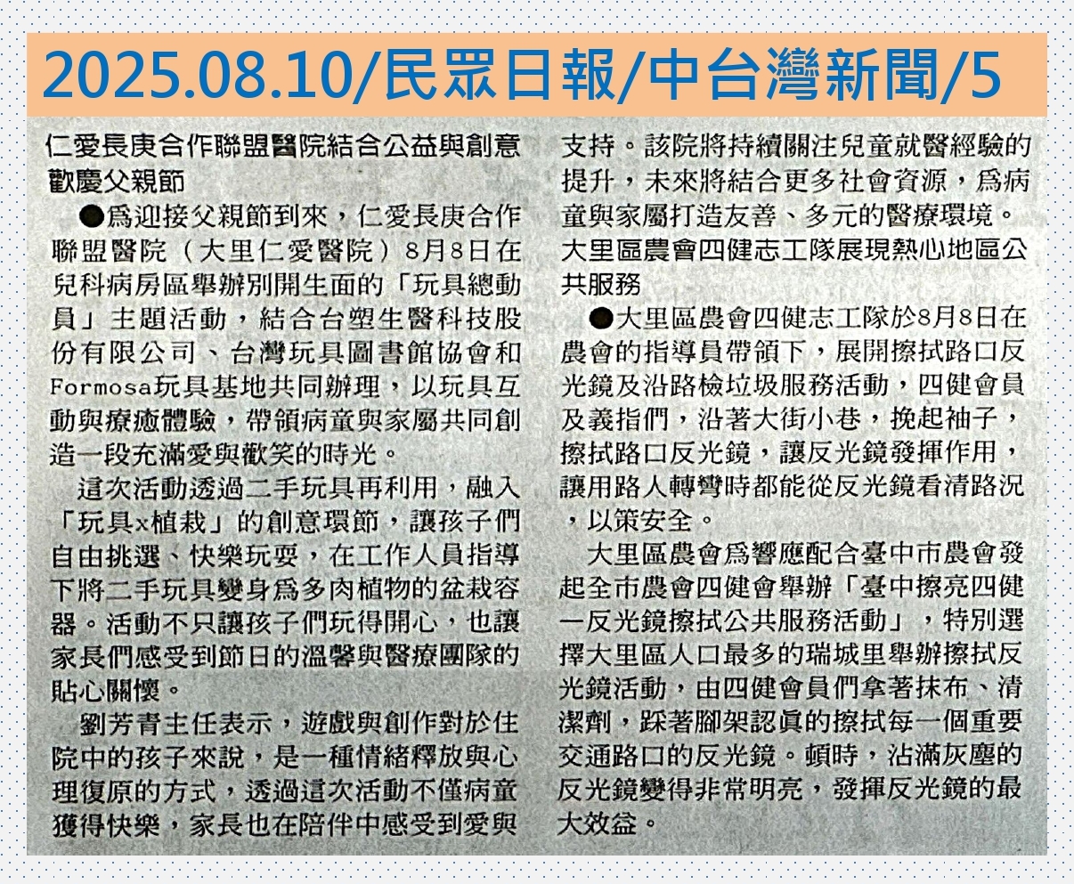 為迎接父親節到來,仁愛長庚合作聯盟醫院(大里仁愛醫院)8日在兒科病房區舉辦別開生面的「玩具總動員」主題活動,結合台塑生醫科技股份有限公司、台灣玩具圖書館協會和Formosa玩具基地共同辦理,以玩具互動與療癒體驗,帶領病童與家屬共同創造一段充滿愛與歡笑的時光。