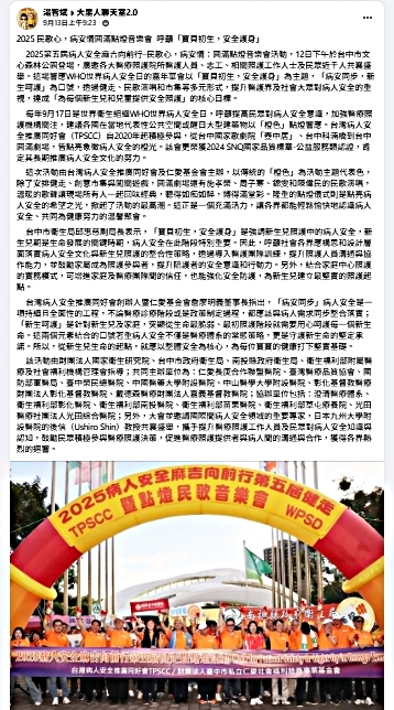 每年9月17日是世界衛生組織WHO世界病人安全日,呼籲提高民眾對病人安全意識,加強醫療照護機構關注,建議各國在當地代表性公共空間或醒目大型建築物以「橙色」點燈響應。台灣病人安全推廣同好會(TPSCC)自2020年起積極參與,從台中國家歌劇院「壺中居」、台中科湳橋到台中圓滿劇場,皆點亮象徵病人安全的橙光。該會更榮獲2024 SNQ國家品質標章-公益服務類認證,肯定其長期推廣病人安全文化的努力。