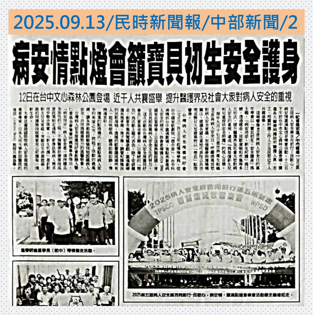 2025第五屆病人安全麻吉向前行–民歌心,病安情:圓滿點燈音樂會活動,12日下午於台中市文心森林公園登場,廣邀各大醫療照護院所醫護人員、志工、相關照護工作人士及民眾近千人共襄盛舉。這場響應WHO世界病人安全日的嘉年華會以「寶貝初生,安全護身」為主題,「病安同步,新生呵護」為口號,透過健走、民歌演唱和市集等多元形式,提升醫護界及社會大眾對病人安全的重視,達成「為每個新生兒和兒童提供安全照護」的核心目標。