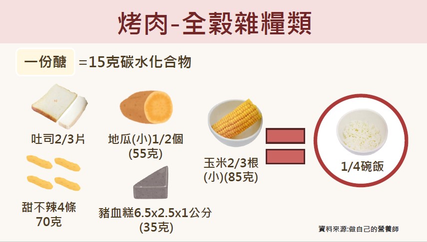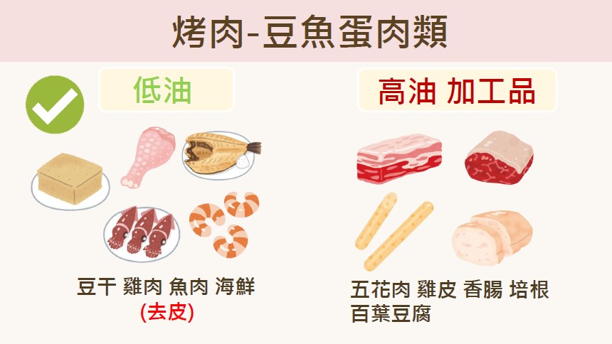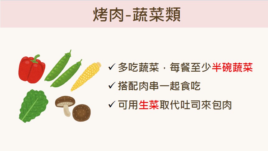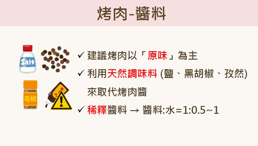 4.醬料:烤肉醬含高鈉、高糖,建議食材盡量以原味為主,如要調味可利用天然調味料、辛香料取代或稀釋醬料後使用,也可在家自製烤肉醬,以減少身體負擔。