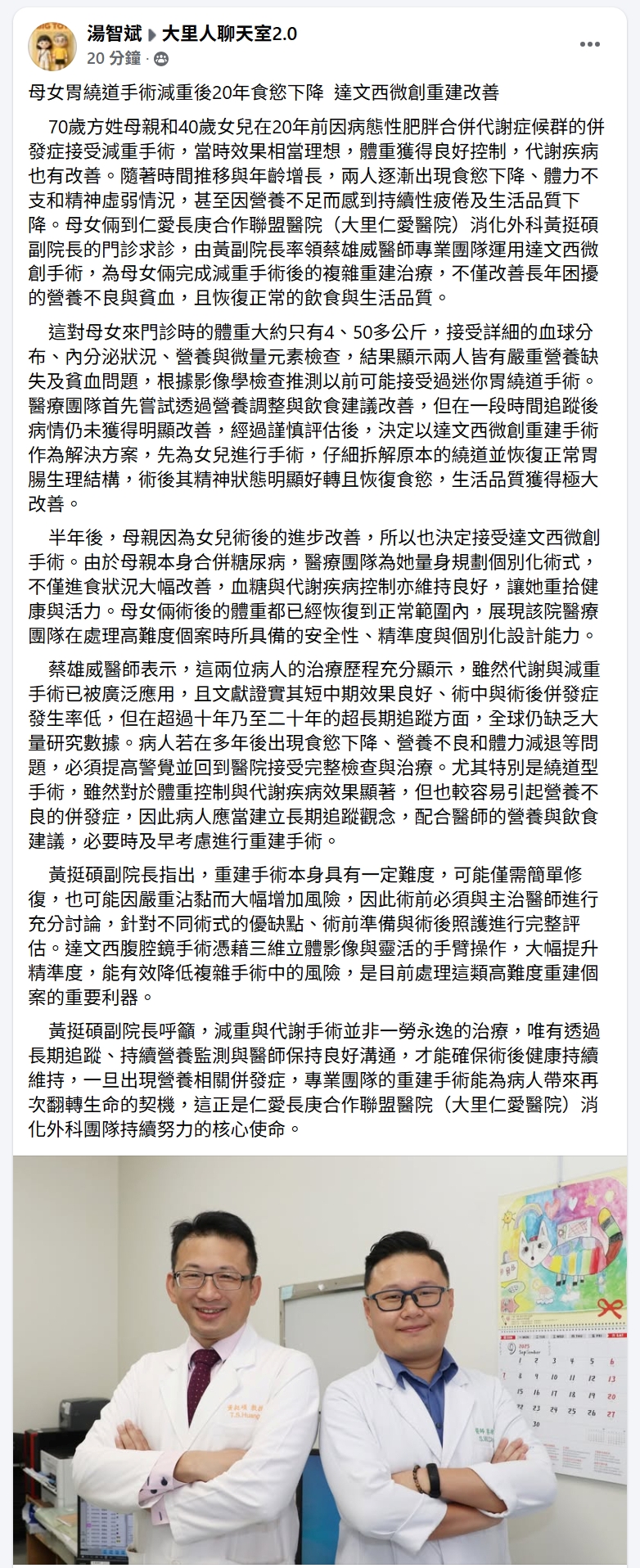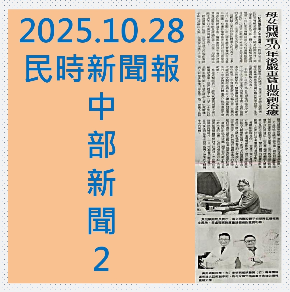 70歲方姓母親和40歲女兒在20年前因病態性肥胖合併代謝症候群的併發症接受減重手術,當時效果相當理想,體重獲得良好控制,代謝疾病也有改善。隨著時間推移與年齡增長,兩人逐漸出現食慾下降、體力不支和精神虛弱情況,甚至因營養不足而感到持續性疲倦及生活品質下降。母女倆到仁愛長庚合作聯盟醫院(大里仁愛醫院)消化外科黃挺碩副院長的門診求診,由黃副院長率領蔡雄威醫師專業團隊運用達文西微創手術,為母女倆完成減重手術後的複雜重建治療,不僅改善長年困擾的營養不良與貧血,且恢復正常的飲食與生活品質。