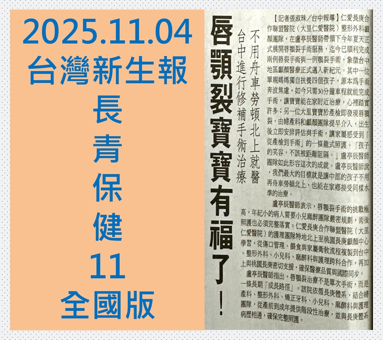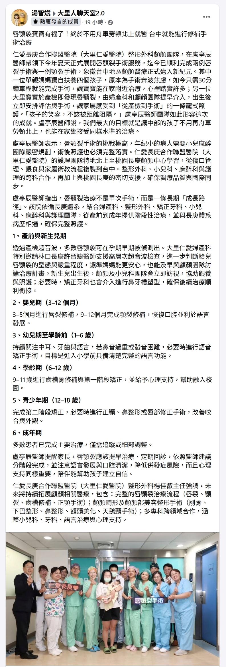 仁愛長庚合作聯盟醫院(大里仁愛醫院)整形外科顱顏團隊,在盧亭辰醫師帶領下今年夏天正式展開唇顎裂手術服務,迄今已順利完成兩例唇裂手術與一例顎裂手術,象徵台中地區顱顏醫療正式邁入新紀元。其中一位單親媽媽獨自扶養四個孩子,原本為手術奔波焦慮,如今只需30分鐘車程就能完成手術,讓寶寶能在家附近治療,心裡踏實許多;另一位大里寶寶於產檢即發現唇顎裂,由婦產科和顱顏團隊提早介入,出生後立即安排評估與手術,讓家屬感受到「從產檢到手術」的一條龍式照護。「孩子的笑容,不該被距離阻隔。」盧亭辰醫師團隊如此形容這次的成就。盧亭辰醫師說,我們最大的目標就是讓中部的孩子不用再舟車勞頓北上,也能在家鄉接受同樣水準的治療。