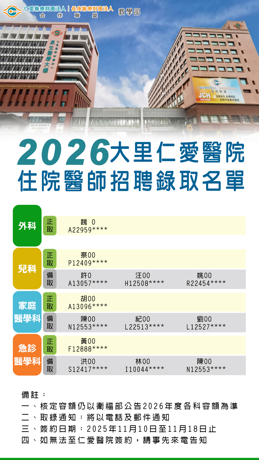 再次感謝所有參與2026年度大里仁愛住院醫師招募的醫師!