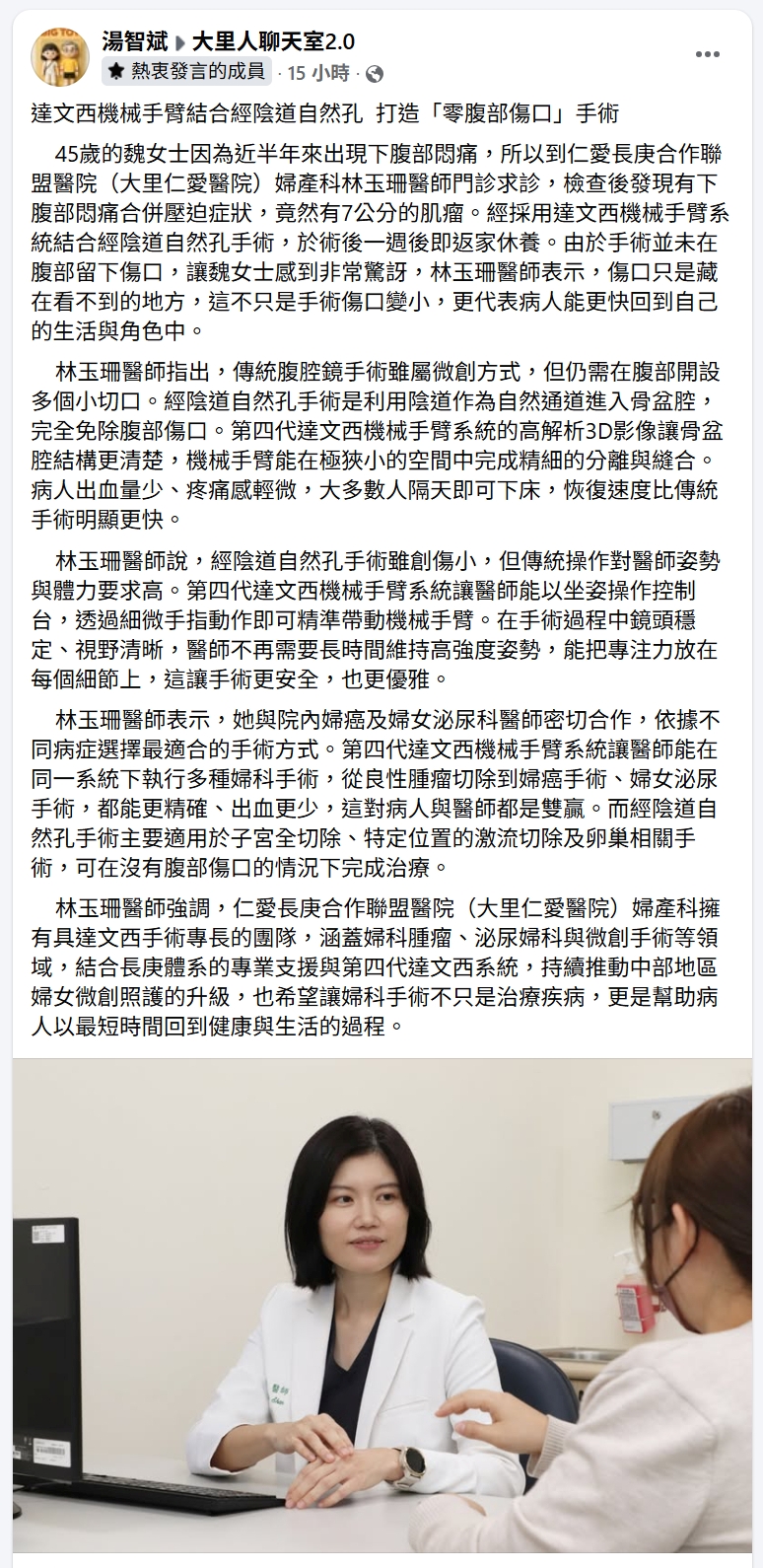45歲的魏女士因為近半年來出現下腹部悶痛,所以到仁愛長庚合作聯盟醫院(大里仁愛醫院)婦產科林玉珊醫師門診求診,檢查後發現有下腹部悶痛合併壓迫症狀,竟然有7公分的肌瘤。經採用達文西機械手臂系統結合經陰道自然孔手術,於術後一週後即返家休養。由於手術並未在腹部留下傷口,讓魏女士感到非常驚訝,林玉珊醫師表示,傷口只是藏在看不到的地方,這不只是手術傷口變小,更代表病人能更快回到自己的生活與角色中。