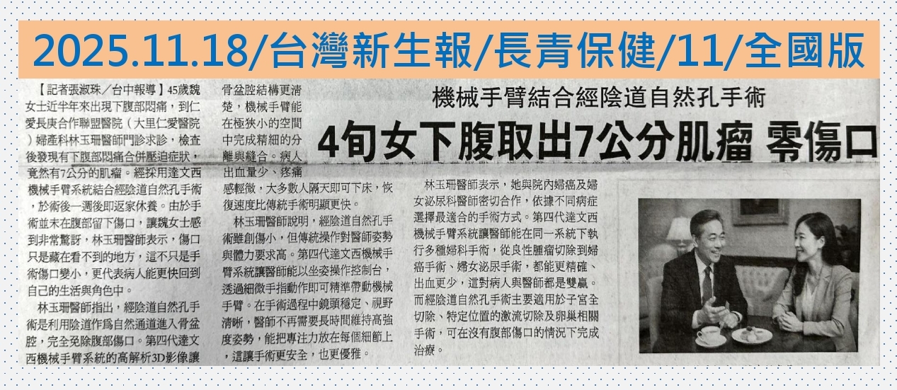 林玉珊醫師強調,仁愛長庚合作聯盟醫院(大里仁愛醫院)婦產科擁有具達文西手術專長的團隊,涵蓋婦科腫瘤、泌尿婦科與微創手術等領域,結合長庚體系的專業支援與第四代達文西系統,持續推動中部地區婦女微創照護的升級,也希望讓婦科手術不只是治療疾病,更是幫助病人以最短時間回到健康與生活的過程。