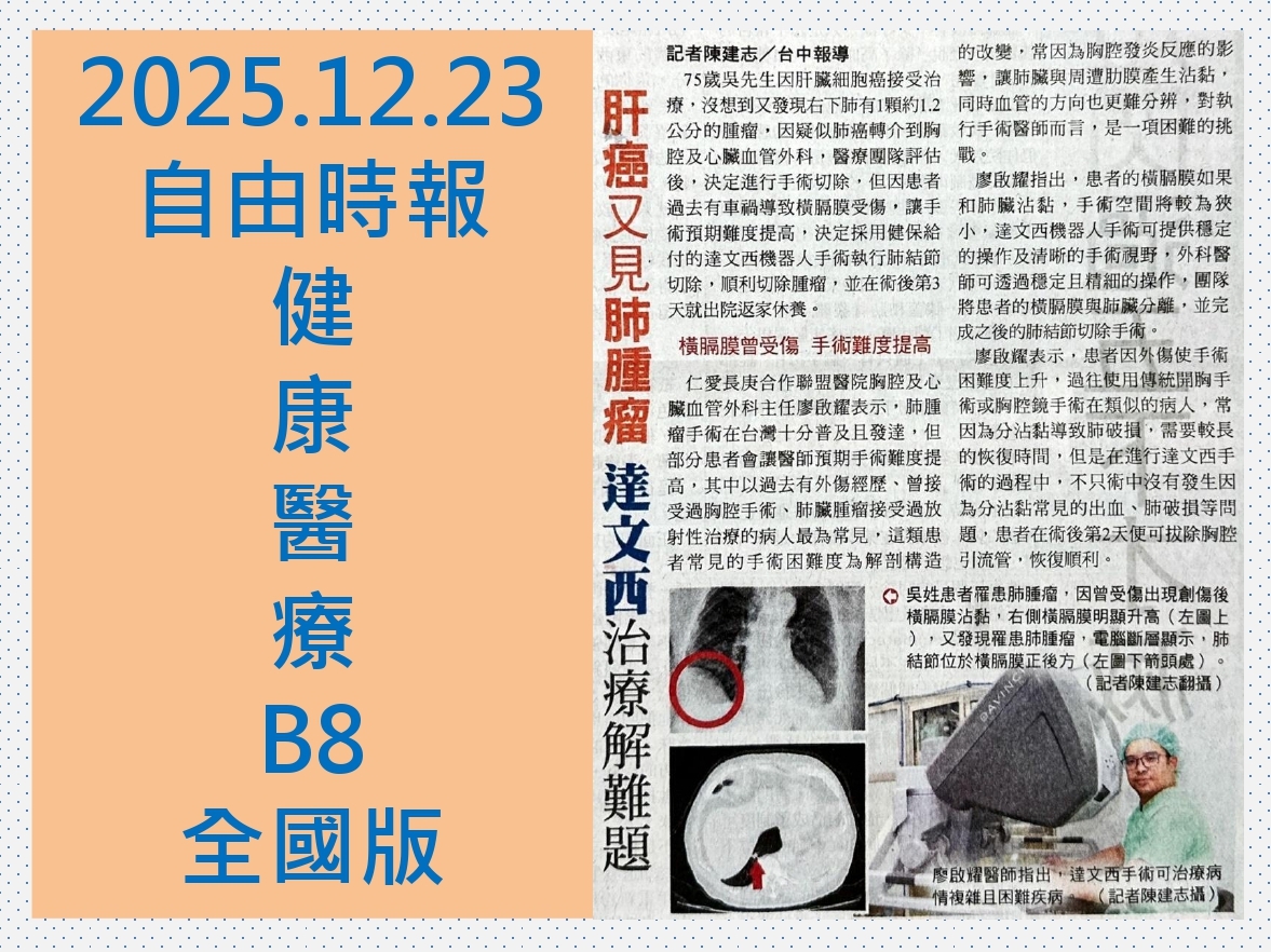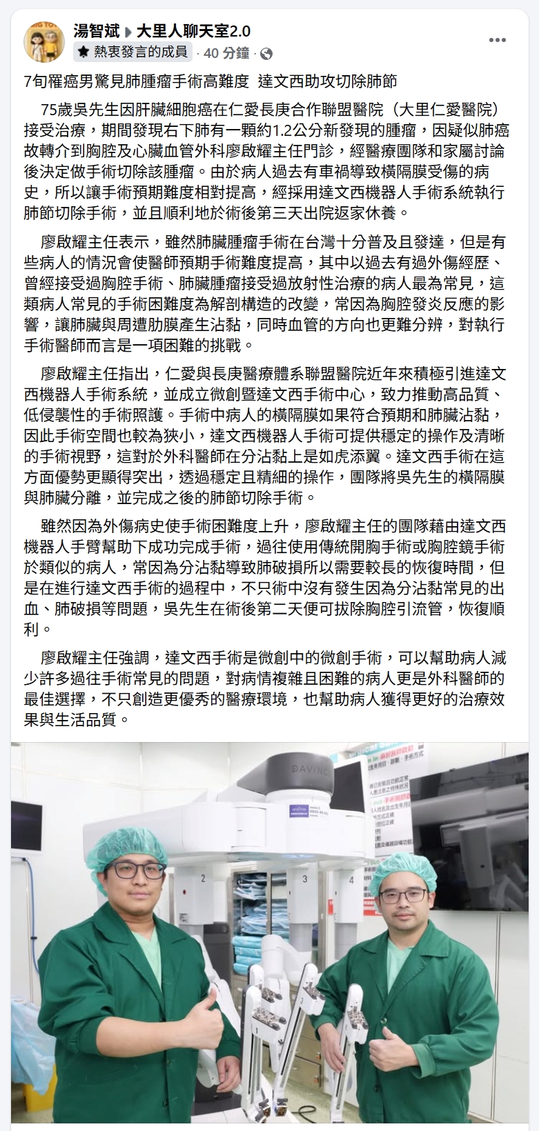 75歲吳先生因肝臟細胞癌在仁愛長庚合作聯盟醫院(大里仁愛醫院)接受治療,期間發現右下肺有一顆約1.2公分新發現的腫瘤,因疑似肺癌故轉介到胸腔及心臟血管外科廖啟耀主任門診,經醫療團隊和家屬討論後決定做手術切除該腫瘤。由於病人過去有車禍導致橫隔膜受傷的病史,所以讓手術預期難度相對提高,經採用達文西機器人手術系統執行肺節切除手術,並且順利地於術後第三天出院返家休養。