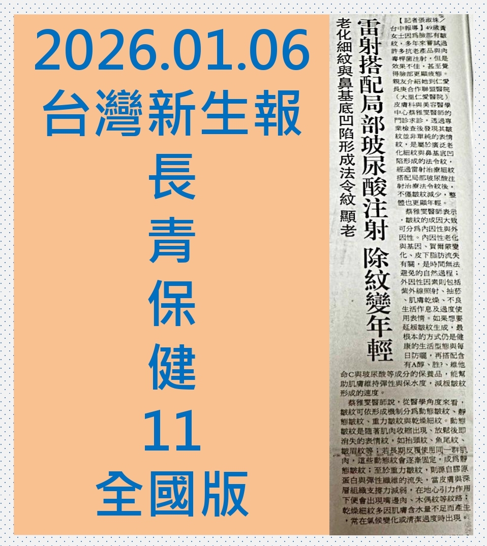 蔡雅雯醫師表示,皺紋是許多人最先注意到的老化跡象。許多人一旦發現臉上出現細紋,便立刻購買各式抗老保養品,或尋求注射治療,希望能迅速恢復年輕。然而,這些表面看起來相似的紋路,其實有著截然不同的成因與對應治療方式。若未釐清皺紋本質而貿然治療,效果往往有限,甚至可能讓問題更加明顯。