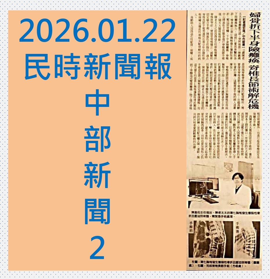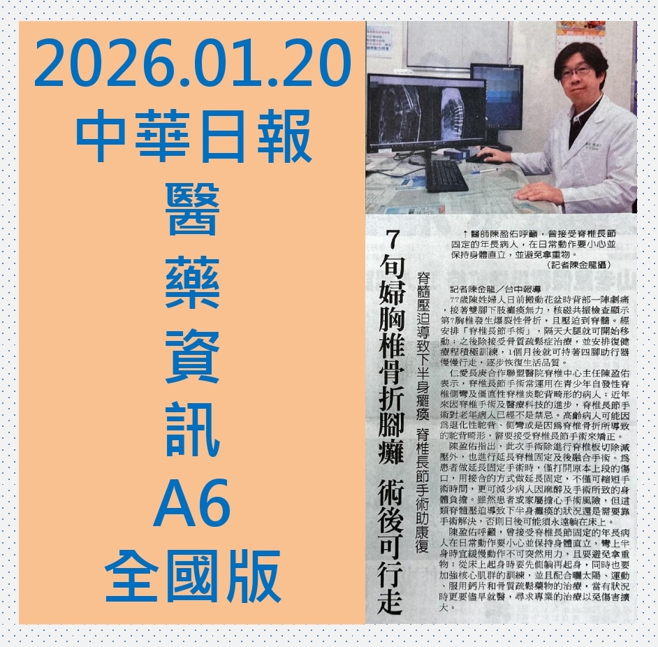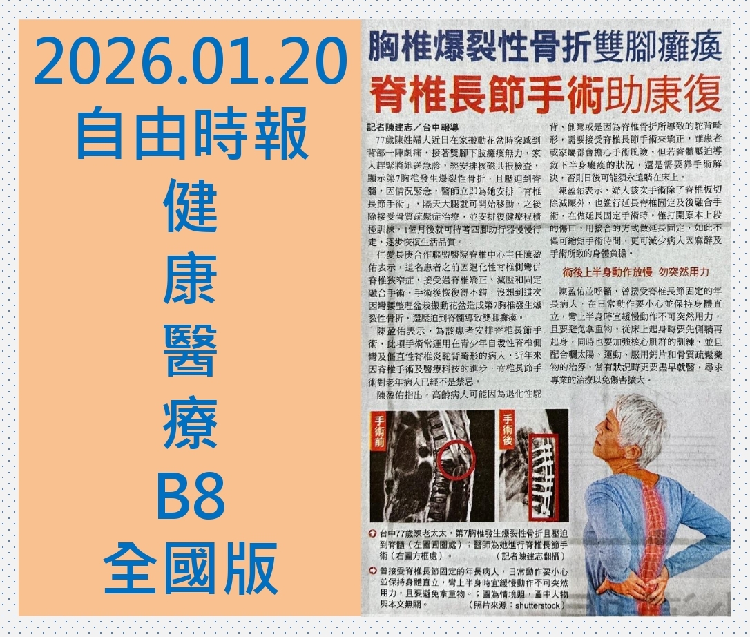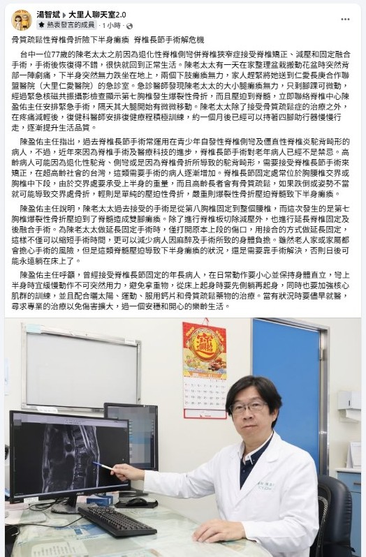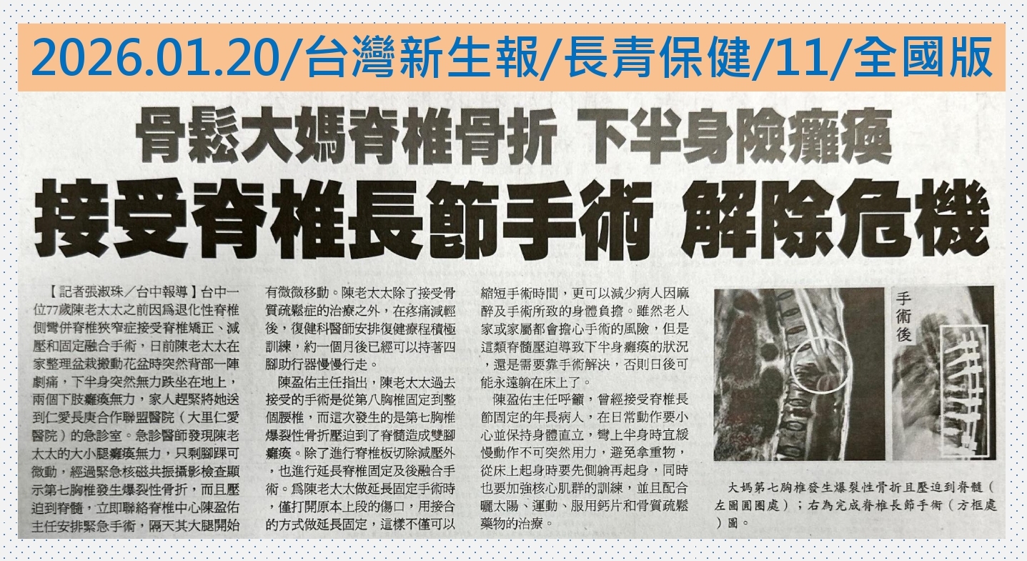 台中一位77歲的陳老太太之前因為退化性脊椎側彎併脊椎狹窄症接受脊椎矯正、減壓和固定融合手術,手術後恢復得不錯,很快就回到正常生活。陳老太太有一天在家整理盆栽搬動花盆時突然背部一陣劇痛,下半身突然無力跌坐在地上,兩個下肢癱瘓無力,家人趕緊將她送到仁愛長庚合作聯盟醫院(大里仁愛醫院)的急診室。急診醫師發現陳老太太的大小腿癱瘓無力,只剩腳踝可微動,經過緊急核磁共振攝影檢查顯示第七胸椎發生爆裂性骨折,而且壓迫到脊髓,立即聯絡脊椎中心陳盈佑主任安排緊急手術,隔天其大腿開始有微微移動。陳老太太除了接受骨質疏鬆症的治療之外,在疼痛減輕後,復健科醫師安排復健療程積極訓練,約一個月後已經可以持著四腳助行器慢慢行走,逐漸提升生活品質。