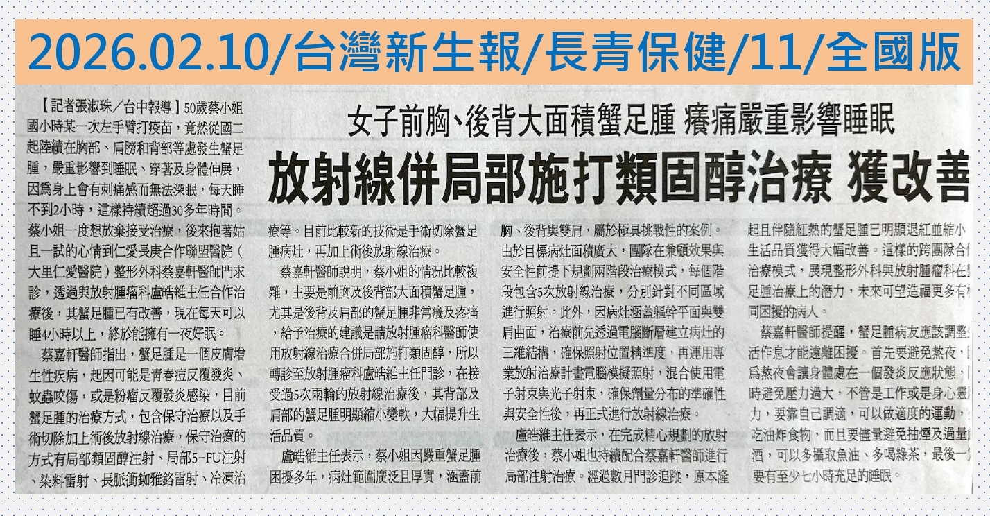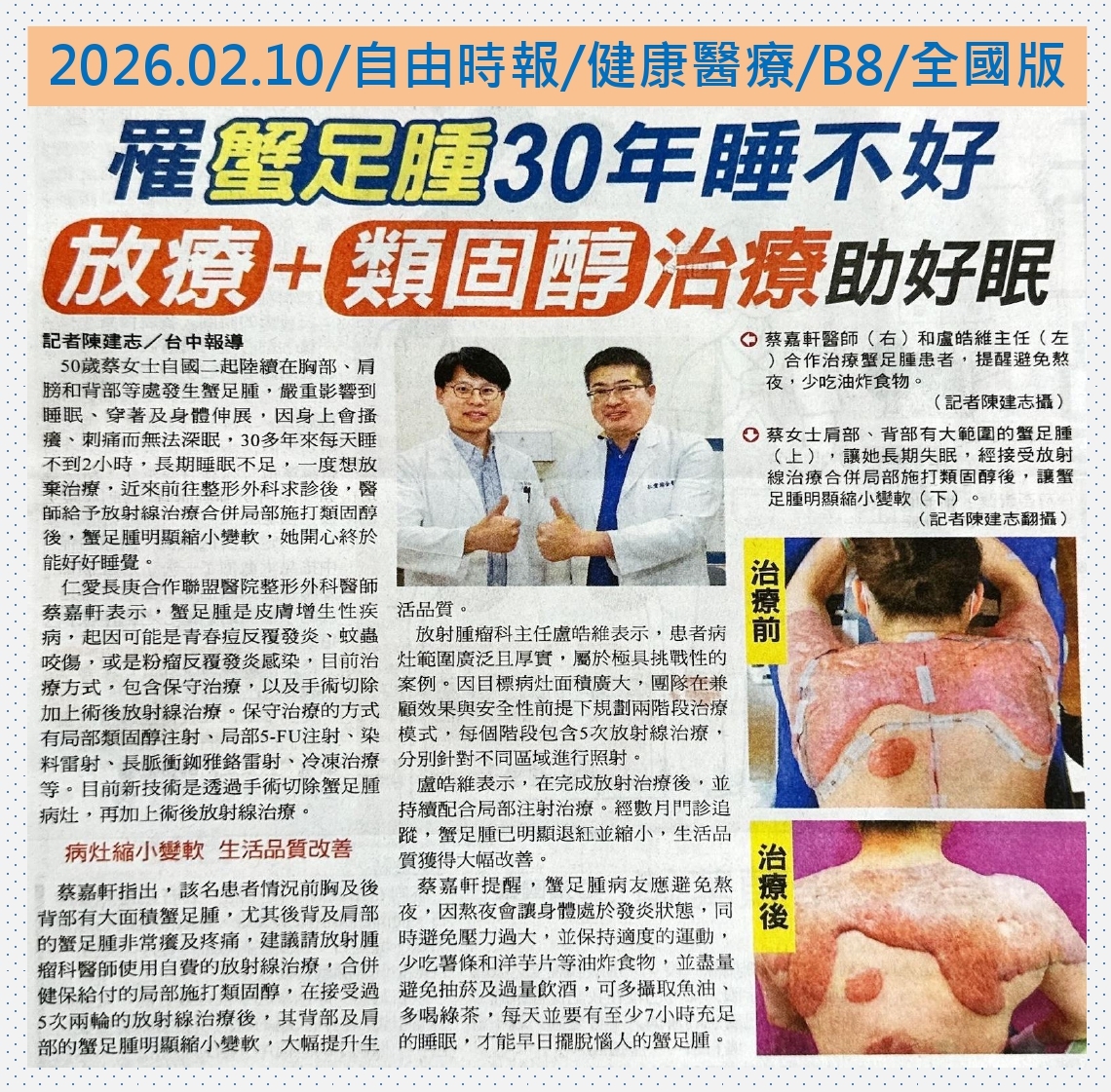 50歲的蔡小姐國小時某一次左手臂打疫苗,竟然從國二起陸續在胸部、肩膀和背部等處發生蟹足腫,嚴重影響到睡眠、穿著及身體伸展,因為身上會有刺痛感而無法深眠,每天睡不到2小時,這樣持續超過30多年時間。蔡小姐一度想放棄接受治療,後來抱著姑且一試的心情到仁愛長庚合作聯盟醫院(大里仁愛醫院)整形外科蔡嘉軒醫師門求診,透過與放射腫瘤科盧皓維主任合作治療後,其蟹足腫已有改善,現在每天可以睡4小時以上,終於能擁有一夜好眠。