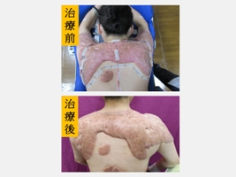 蔡嘉軒醫師說,蔡小姐的情況比較複雜,主要是前胸及後背部大面積蟹足腫,尤其是後背及肩部的蟹足腫非常癢及疼痛,給予治療的建議是請放射腫瘤科醫師使用放射線治療合併局部施打類固醇,所以轉診至放射腫瘤科盧皓維主任門診,在接受過5次兩輪的放射線治療後,其背部及肩部的蟹足腫明顯縮小變軟,大幅提升生活品質。