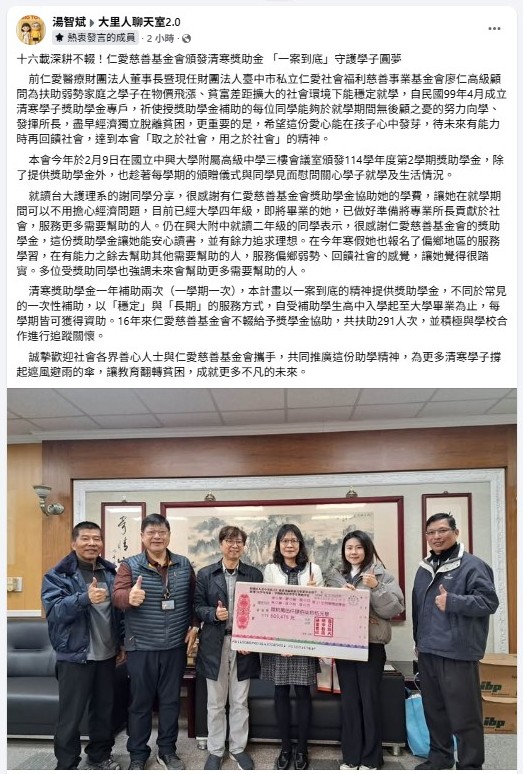 前仁愛醫療財團法人董事長暨現任財團法人臺中市私立仁愛社會福利慈善事業基金會廖仁高級顧問為扶助弱勢家庭之學子在物價飛漲、貧富差距擴大的社會環境下能穩定就學,自民國99年4月成立清寒學子獎助學金專戶,祈使授獎助學金補助的每位同學能夠於就學期間無後顧之憂的努力向學、發揮所長,盡早經濟獨立脫離貧困,更重要的是,希望這份愛心能在孩子心中發芽,待未來有能力時再回饋社會,達到本會「取之於社會,用之於社會」的精神。