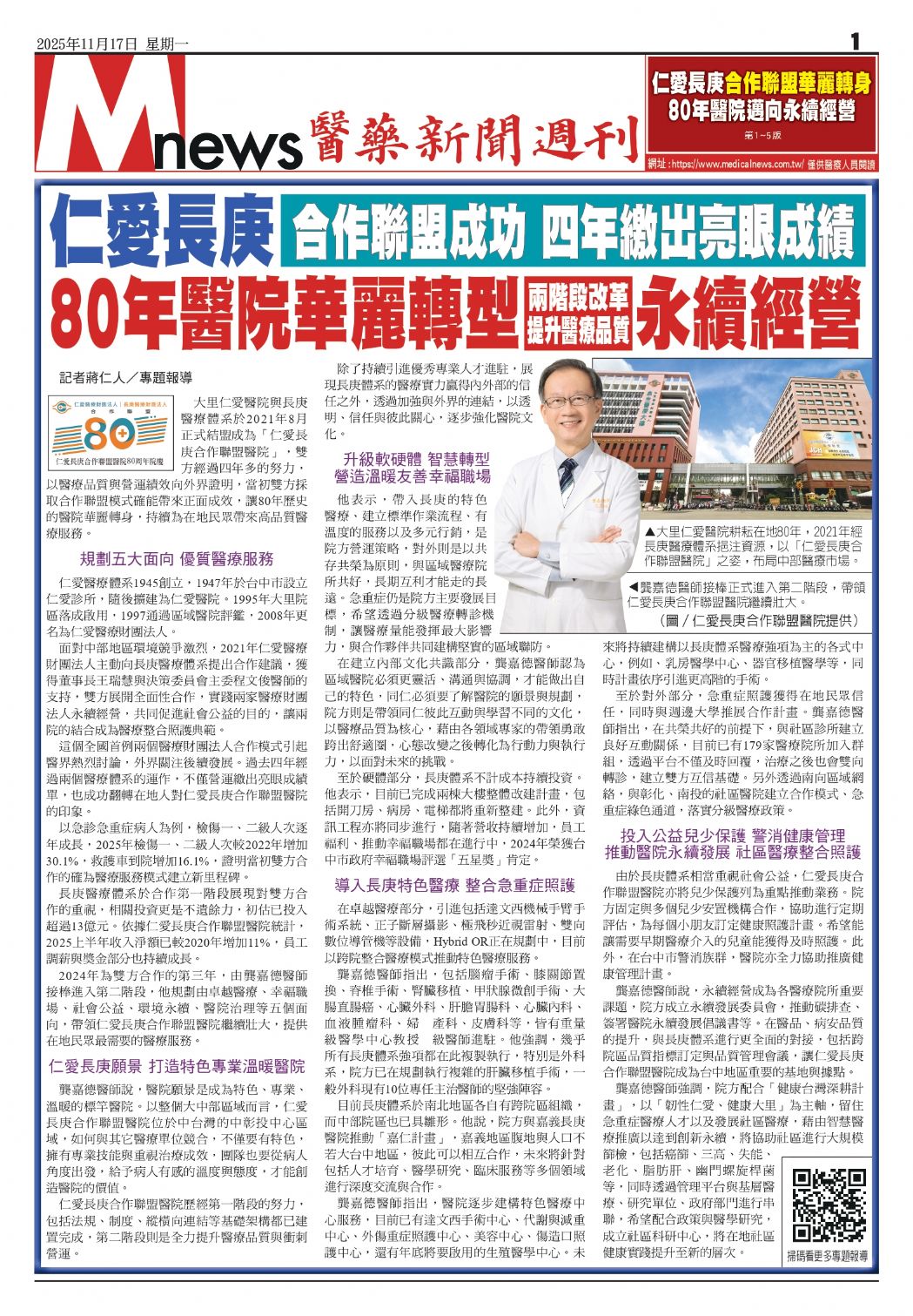 1.第一版_仁愛長庚合作聯盟華麗轉身80年醫院邁向永續經營_龔嘉德院長專訪(附件一)(1)卓越醫療:導入長庚特色醫療整合急重症照護(2)幸福職場:營造溫暖幸福友善職場(3)社會公益:投入公益兒少保護警..More